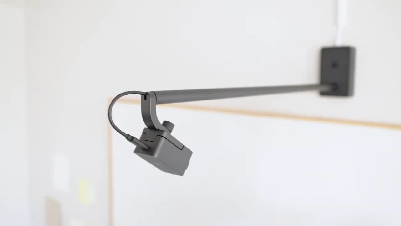 Logitech Scribe es el primer dispositivo certificado que admite la nueva categoría de hardware de cámara de pizarra. El dispositivo es una estructura similar a una lámpara que se extiende desde la pared con una cámara cilíndrica en el extremo.
