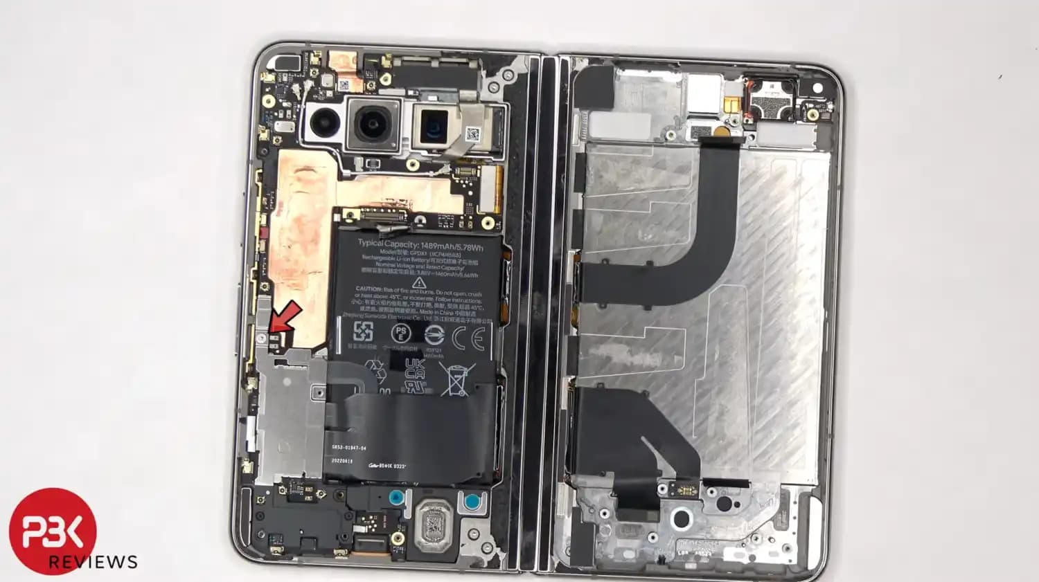 El lado derecho del Pixel Fold también alberga el primer motor de vibración, el altavoz superior, el lector de tarjetas SIM, el altavoz del auricular y la placa de antena.